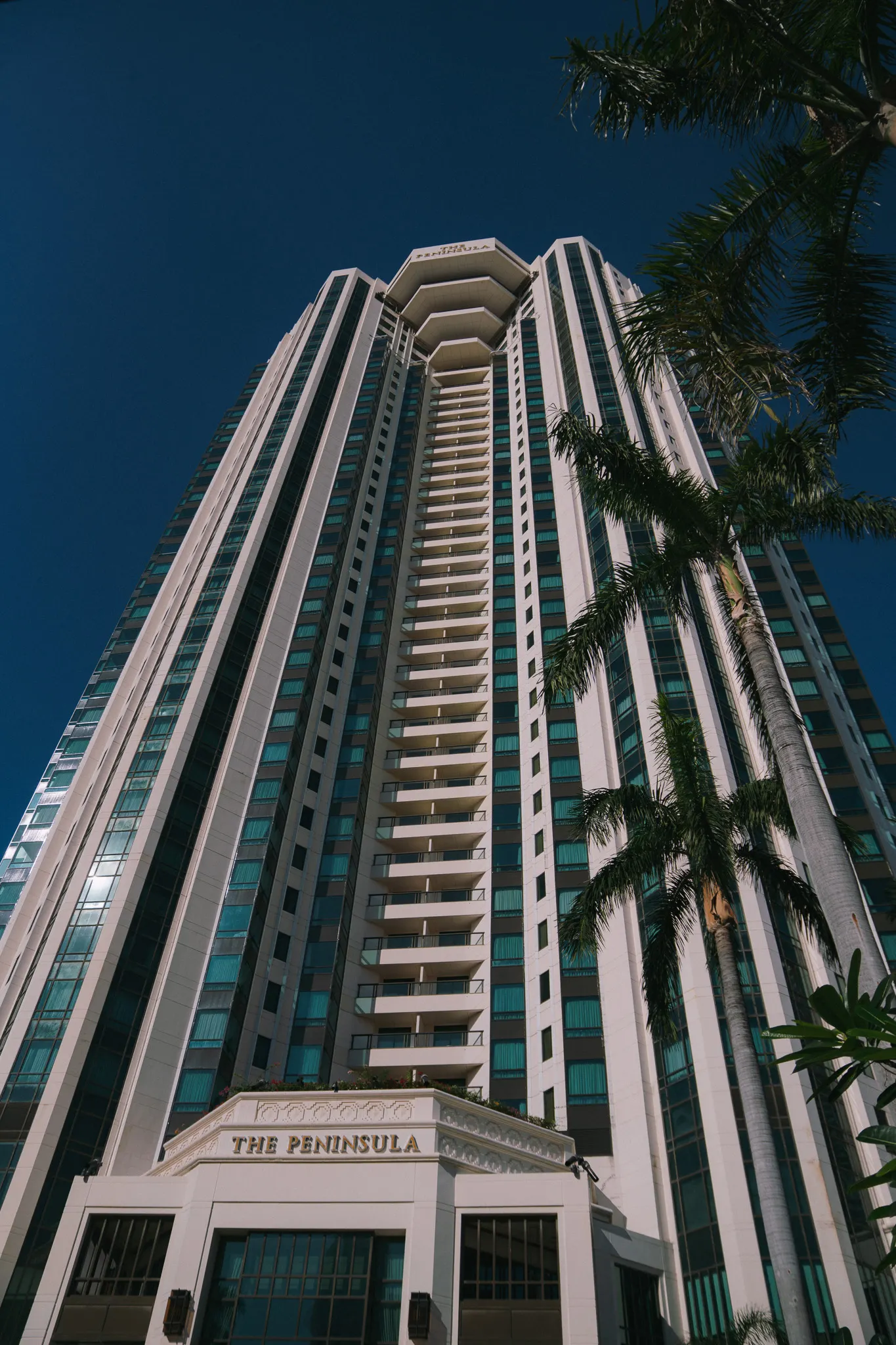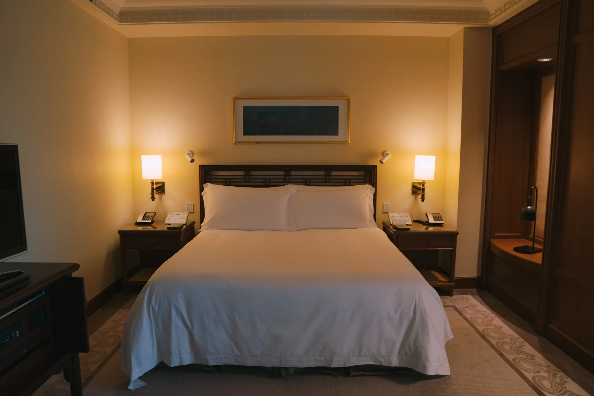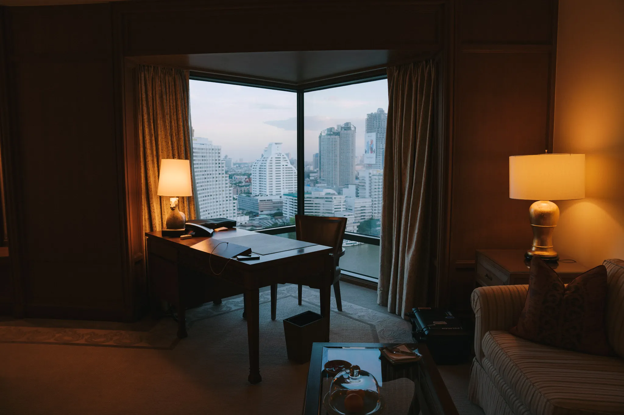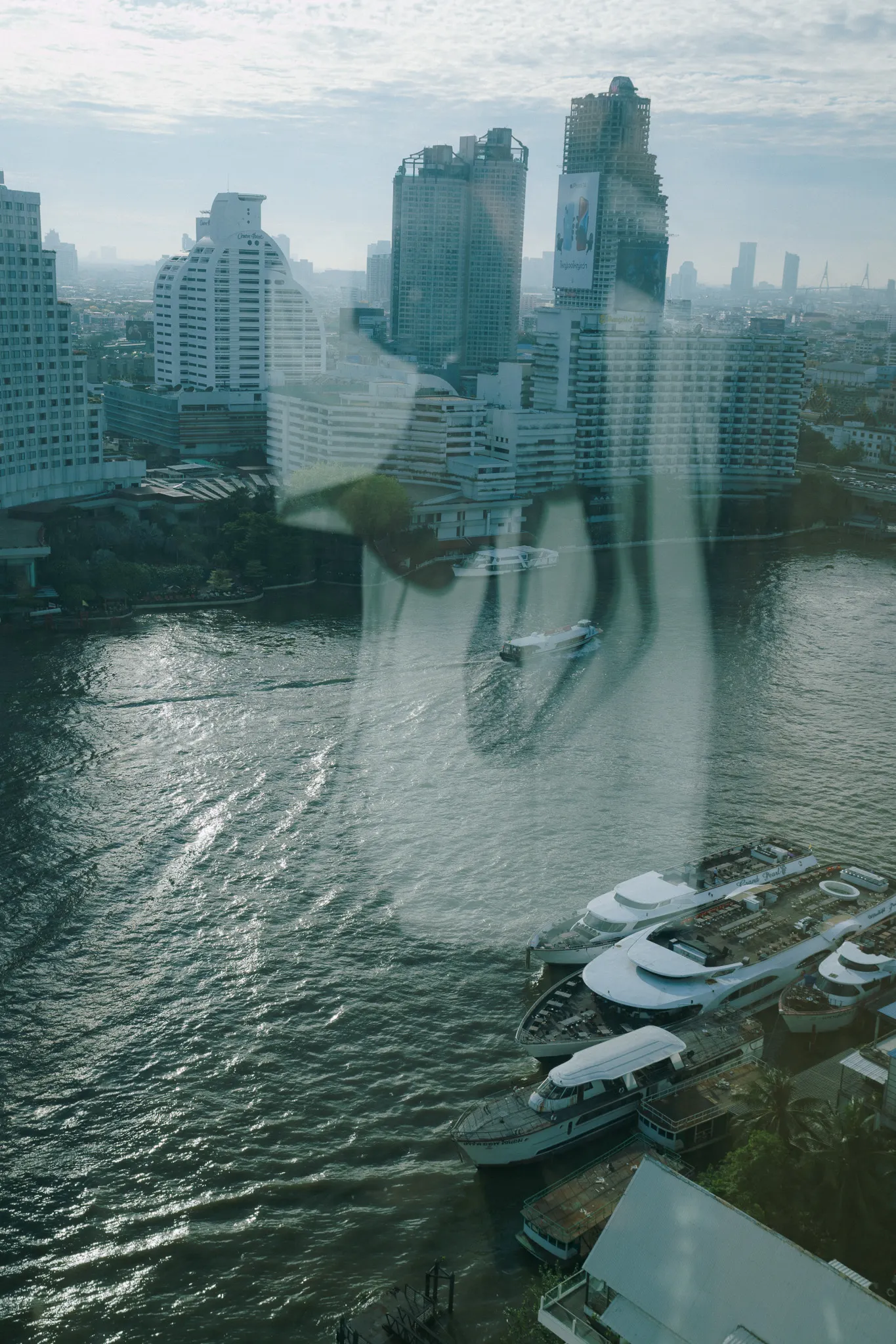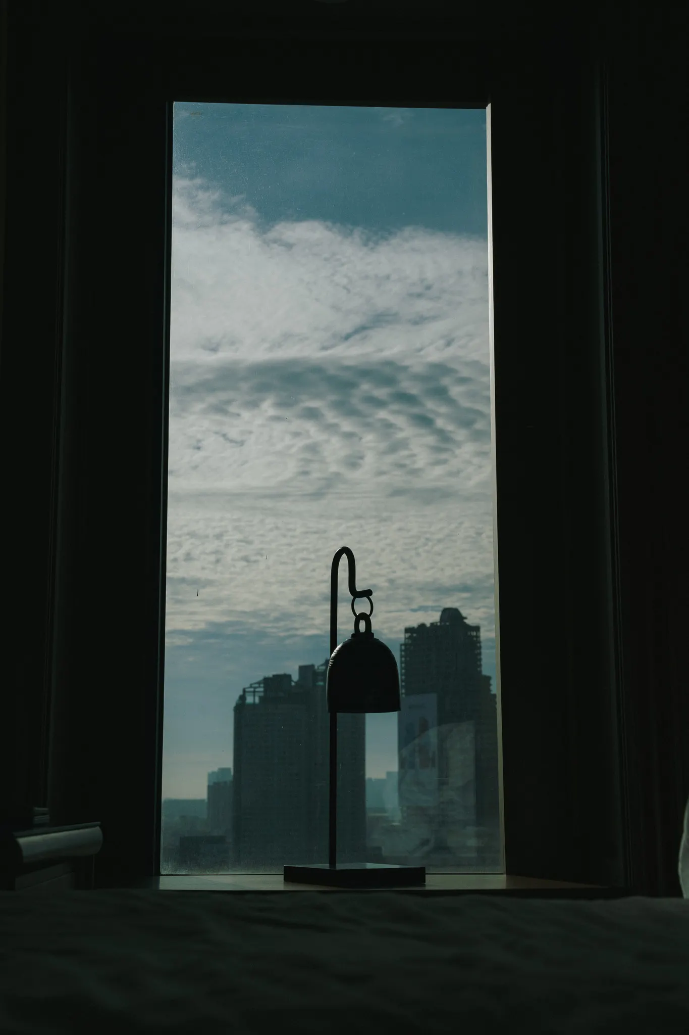 침대 바로 옆으로 시티뷰와 하늘이 보인다.